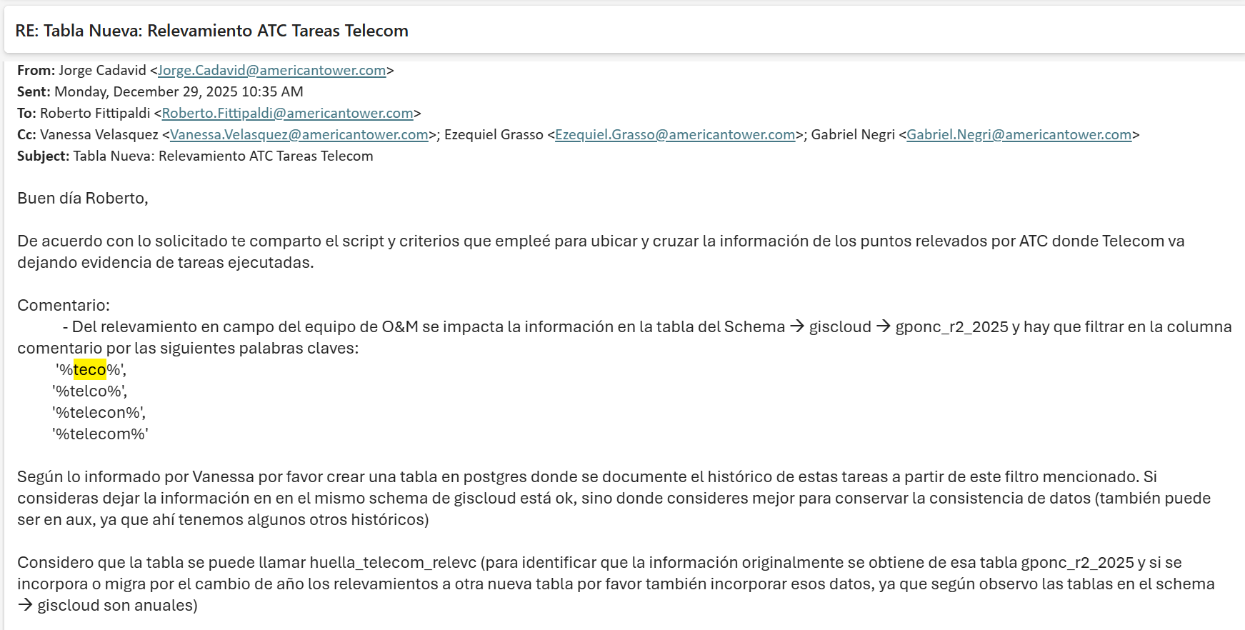 Se generó una función que se alojó en giscloud.huella_comentario(text) que consume un archivo config.txt que soporta strings, regex y comentarios y realiza la busqueda en proyectos gpon, lineales y postes.