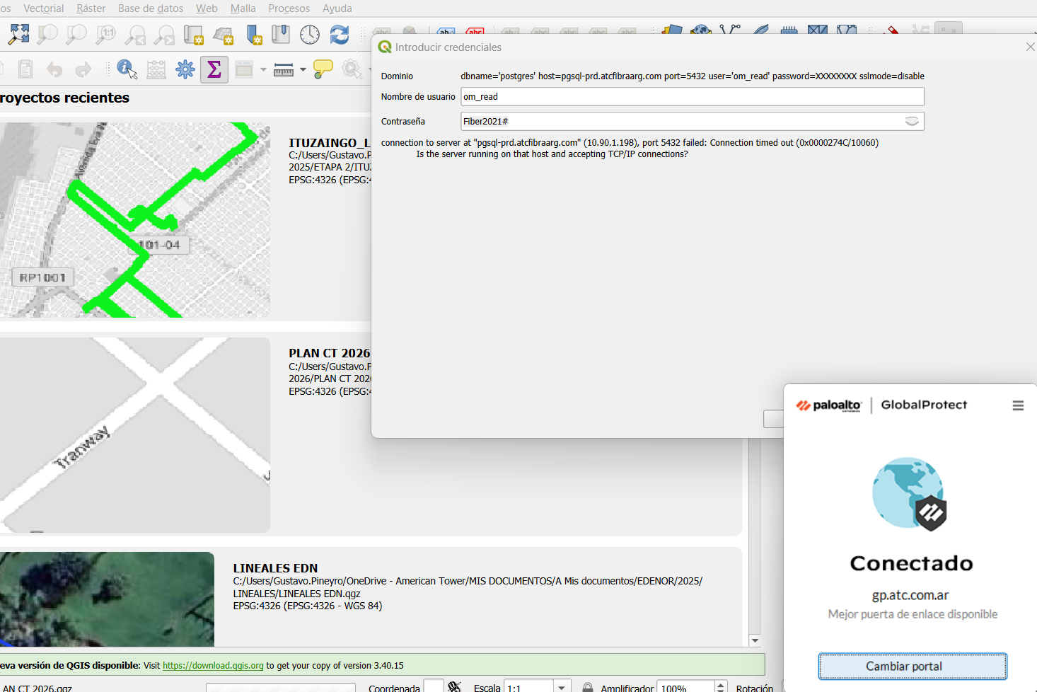 Se recibe el reclamo de Gustavo Piñeyro de que no podía cceder a la base desde QGis