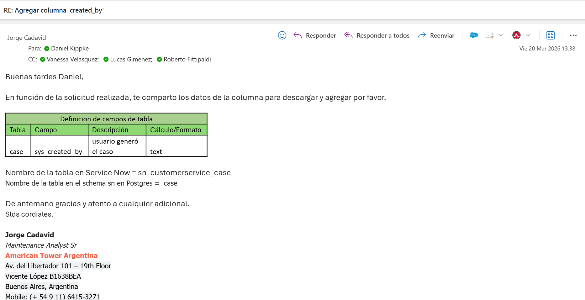 Jorge me solicita por mail el agregado de la columna created_by en la tabla case del schema sn